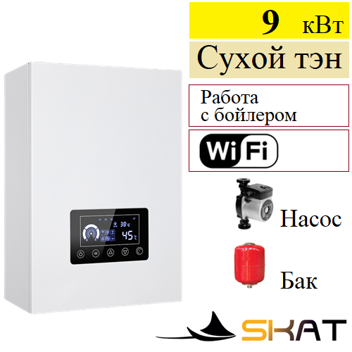 Skat Plus 9 электрический котёл мощностью 9 кВт. Котёл является миникотельной со встроенным насосом и расширительным баком. Предназначен котёл для отопления помещения до 90 м², а также организации приготовления горячей воды при установке внешнего бойлера косвенного нагрева.